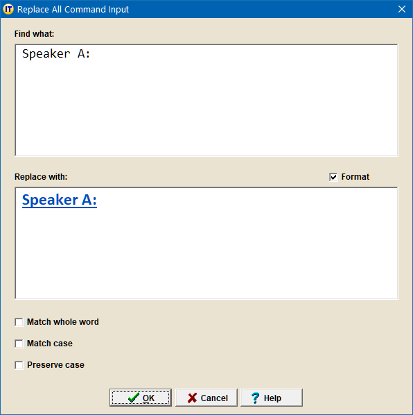 With version 9.56, the Replace All Selection and Replace All Clipboard commands have been enhanced so that you can request the replace to be performed with a formatted replace string:
