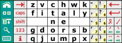 The patented Fitaly key arrangement is optimized for pen entry: the letters ital ne dors and the space – together representing 73% of the keys used for normal text – are placed in a very tight central area. Adding the letters ch and um brings this frequency to 84%. |