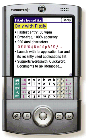 The main purpose of Fitaly is fast typing on a palm device and most characters can be entered with one or two taps. However, when upper case letters are frequent, as in addresses, repeated shifting can be cumbersome. Similarly, when letters and digits are intermixed, toggling 123 repeatedly can become inconvenient.