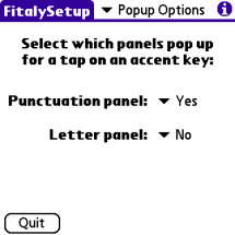 Most users are likely to want punctuation panels to be displayed. On the other hand, showing accented letter panels may not be that useful, as the position of accented letters is easy to infer. In addition, you can always get an accented letter by a tap on the accent key followed by a tap on FitalyStamp itself.