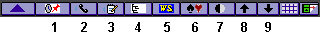Here we are showing buttons 1-6 associated with Datebk5, Address book, MemoPad, Filez, WordSmith, and Bridge. Button 7 is the backlight toggle and 8 and 9 are Page Up and Page Down. The button at the right of 9 shows the position of the builtin Qwerty keyboard. The rightmost button calls FVSetup.