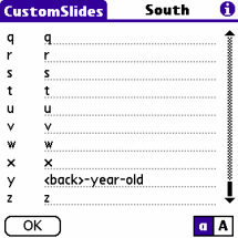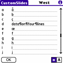 With a tap on the W button, you get the custom slides for the West direction – formerly called left slides in Version 2. The dialog acts as a viewer and lets you see all slides defined for that direction. For example, a slide of the letter "a" in the West direction produces an å, the default for that letter.
