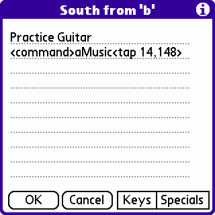 Opening the note editor is done by ‹command›a. Then "Music" is written in the note. Finally, ‹tap 14,148› macro closes the note editor by a tap on its Done button.