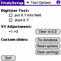 XY Adjustments shows the X and Y adjustments done by FitalyVirtual when you do an Adjust Position. You can clear these adjustments to 0,0. This is especially useful if your Palm is so badly adjusted that you can no longer get the information menu by a tap on the information key.