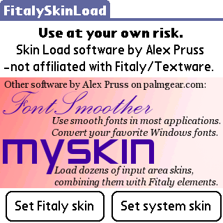 FitalySkinLoad is a Skin Loader developed by Alexander Pruss and which can be used to load the Fitaly skin on a Palm T3, T5, LifeDrive, or TX.