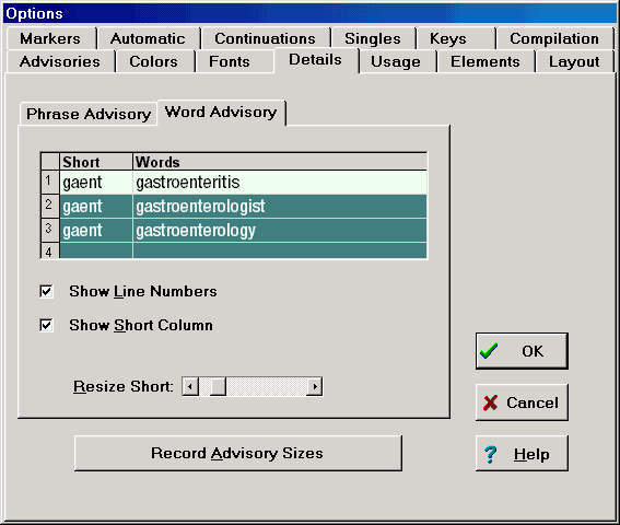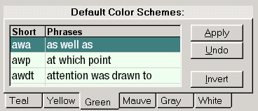 ![]() You can customize the Phrase advisory and the Word advisory separately and specify whether Line Numbers are shown and what size to use for the Short column. For Words you can even decide not to show a short column, as it is not that informative. Finally, you can adjust advisories with the mouse and record current advisory sizes. This has the effect of recording the relative sizes of the two advisories. The memorized proportions are maintained when Instant Text is resized. 4.2 Advisory Colors Instant Text version 3 already offers a way to customize colors but many users stay with the initial setting given at installation time. To make it easier to experiment with alternatives, the new dialog provides default color schemes.