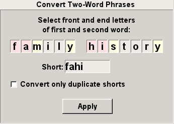 ![]() In this example, following a popular system, the first two letters fa of the first word, and the first two of the second word hi are selected. This produces the four-letter short form fahi. It is possible to apply this transformation to all two-letter entries or only to those that have duplicate short forms. Convert Word Entries to Phrase Entries The Words panel provides ways to convert Word entries in entries of the Phrase section. The following dialog is used to specify a choice of front and end letters to be used for the short form: