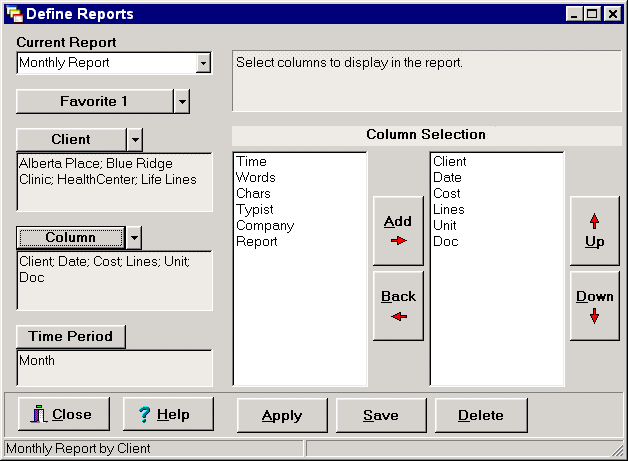 ![]() The Selection Area is where you specify what the report should contain. Using the buttons on the left, you can change which part of the report you want to work on and what appears in the selection area. The first two buttons have alternatives to work with related parts of the report. Clients, Companies, and Typists are selected with the top button . You indicate which one you want to work on by clicking the small arrow next to the button, and choosing from the list that appears. Your current selections appear in the box below the button, so that as you change the selection area, you can see at a glance what choices you've made. Columns, Titles, and Totals are selected with the second button on the left in a similar manner. You can select the columns that will appear in the reports, assign titles to appear at the tops of those columns, select the columns that will be totaled in the report, and add text to the report. The Time Period is selected with the third button on the left. This can be by day, week, month, quarter, year, and so on. Apply and Save. Once you have made all your selections, you can press Apply and see the results in the table on the main screen. When the report is the way you want it, press Save to save it. You can also save it with a different name to create a new report. A new report is always created by modifying an existing report and saving it and you can define a full hierarchy of useful reports. Here are a few examples: