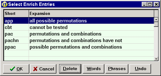 Alt F10 opens the WordPerfect macro selection dialog and this selects the macro GotoHeader.wcm. Then the Enter key closes the macro selection dialog and executes it. Finally, "Voila!" is typed at the current place. 1.5 Enrich Enhancements The new Enrich command now works from the text currently selected in the client application. Then it opens a dialog with the words and phrases found in the selection: