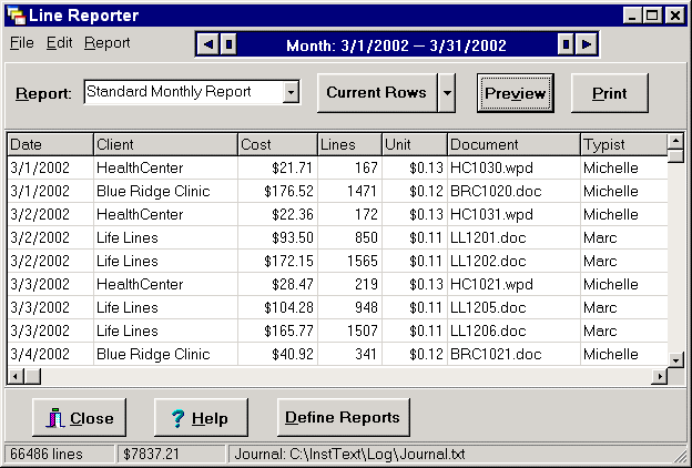 Reports can be instantly viewed, very much in the same way as in programs such as Quicken and QuickBooks. They can also easily be printed or exported in a form that allows them to be merged with Word or WordPerfect documents. In conjunction with the Line Reporter, the Journal becomes a real data base of line counts. In this spirit, the Line Reporter also contains functions to edit records and to backup Journals for certain periods of time or by other user-defined criteria. The Line Reporter Main Screen The main screen of the Line Reporter shows the information from the Journal that will be included in the report.