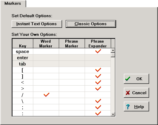 ![]() 4.4 Markers and Expanders Instant Text allows punctuation marks to be "expanders" that cause expansion - as markers do - but stay after the expansion - unlike markers. The set of allowed markers and expanders covers all keys used by PRD, and actually more. The dialog makes it easier to select a package of options for a PRD-like user and those for an IT user. Selecting the Classic options also sets the use of expander keys for Single letter abbreviations.