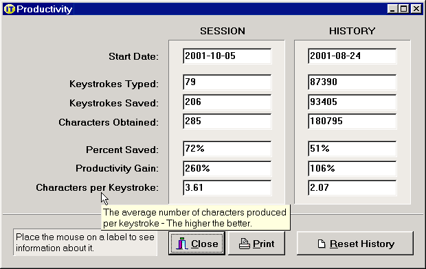![]() The Up and Down buttons can be used to order the merged glossaries. The Change Folder button allows adding glossaries from another folder. 1.7 Productivity Dialog Instant Text V provides productivity statistics on the current session as well as cumulative statistics for past sessions. The dialog offers information such as the keystrokes typed, keystrokes saved, percent saved: