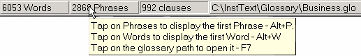 ![]() Two-Letter Group Search The Group search button and its attached two-letter editor offer a fast way to display the group of phrase entries whose short code start with the two letters. Accelerators help. For example, to get the tt two-letter group, you can use the accelerator Ctrl+G to set the focus on the group editor. Then type tt and the accelerator Alt+G. To display the start of the word section, click on "Words" on the status bar or type Alt+W. To show the start of the phrase section, click on "Phrases" or type Alt+P. Here too, you can place the mouse on the status bar to see what these shortcuts are.