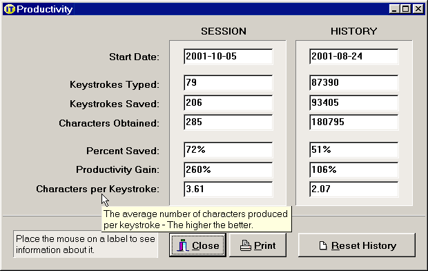 In addition, the Productivity dialog provides a way to measure your productivity, with statistics on the current session as well as cumulative statistics for past sessions. The dialog offers information such as the keystrokes typed, keystrokes saved, percent saved: