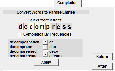 The Comletion panel provides a systematic way to convert Word entries to Phrase entries. The following dialog is used to specify a choice of the number of front letters to be used for the short form: