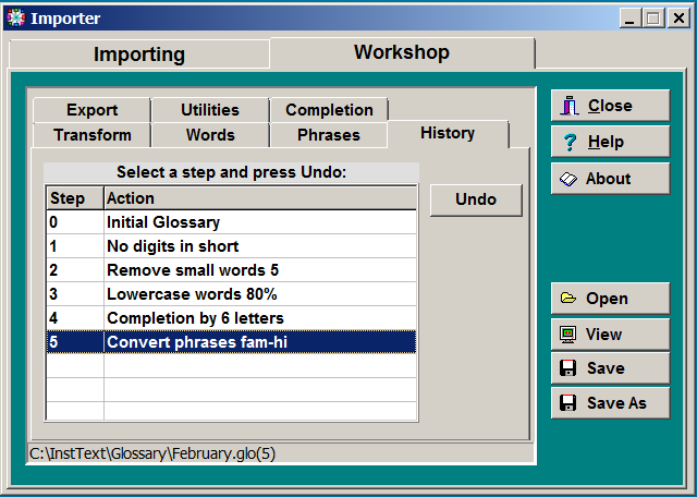 After each step, we can press the View button to view the resulting glossary, or the Save As button to save a variant of the glossary.