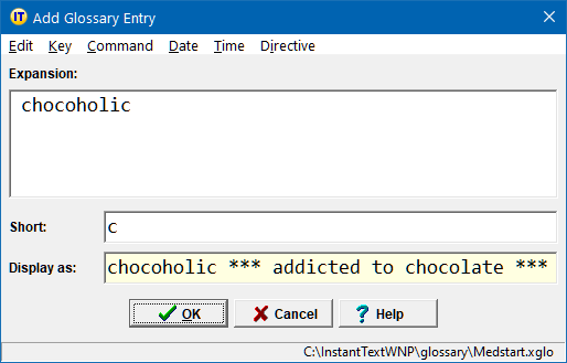 In the following example, we are adding a Word Entry to the Current Glossary using the Add Glossary Entry window: