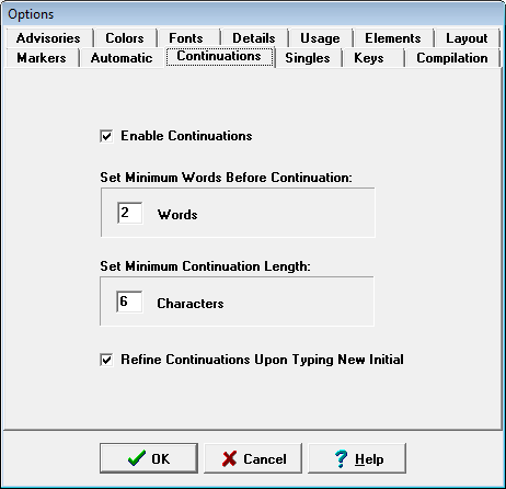 The Continuations menu item of the Options Menu opens the Options Continuations page that lets you specify whether you want continuations to be suggested and fine-tune the quality of the continuations.