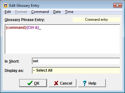 Display forms are also ideal for Command Entries. In the following example we defined a command with the keyboard shortcut Ctrl+A and a Display form of ~ Select All which will turn out to be a lot more readable in the advisories than {command}{Ctrl A}_