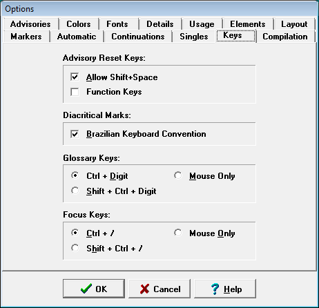 The Special Keys menu item of the Options Menu opens the Options Keys page that lets you specify several options regarding the use of Special Keys.