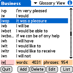 For example, the picture on the left shows phrases contained in the Business glossary, one of the glossaries supplied with Instant Text Mobile. Business includes typical phrases used in everyday correspondance or email. Other supplied glossaries such as Legal, Medicals, and Internet are more specialized.