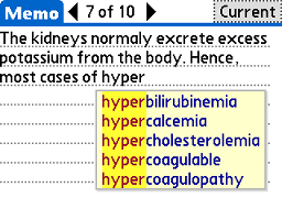 This approach of typing the first few letters of a word is called "word completion" and it is about as old as computers. It is useful but rather limited as our second example will now illustrate. We are trying to type the word "hyperkalemia" but see what the advisories display after typing hyper.
