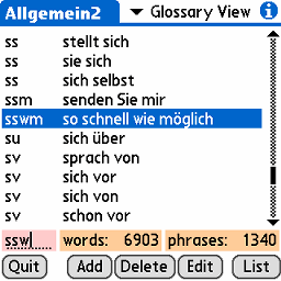 Ebenfalls am unteren Rand des Bildes befindet sich links ein Suchfeld. Durch Eingabe einiger Buchstaben in dieses Feld können Sie schnell Einträge des Verzeichnisses finden. Tippen Sie z.B. ssw ein, wird der erste Eintrag markiert, dessen Kurzform mit diesen Buchstaben beginnt: "so schnell wie möglich."