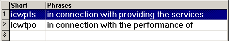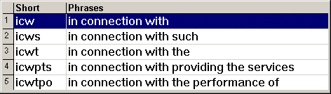 The abbreviations are listed in the "Short" column and the corresponding expansions are on the right, in the "Phrases" column. Should you like the first choice (in the highlighted row), typing the marker ; expands it. Thus, you typed ic; and it expanded into If Contractor is required. Note that you didn't even have to type the full four letters icir. You abbreviated the abbreviation!