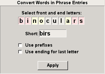 ![]() In this example, following a popular system, the first two letters fa of the first word, and the first two of the second word hi are selected. This produces the four-letter short form fahi. It is possible to apply this transformation to all two-letter entries or only to those that have duplicate short forms. Convert Word Entries to Phrase Entries The Words panel provides ways to convert Word entries in entries of the Phrase section. The following dialog is used to specify a choice of front and end letters to be used for the short form: