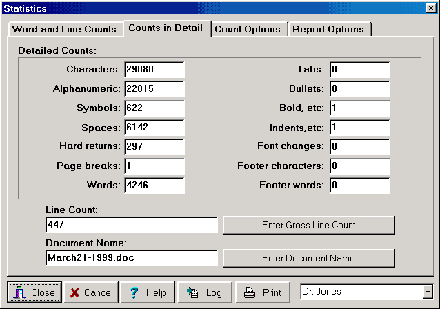 Reports can be instantly viewed, very much in the same way as in programs such as Quicken and QuickBooks. They can also easily be printed or exported in a form that allows them to be merged with Word or WordPerfect documents. In conjunction with the Line Reporter, the Journal becomes a real data base of line counts. In this spirit, the Line Reporter also contains functions to edit records and to backup Journals for certain periods of time or by other user-defined criteria. The Line Reporter Main Screen The main screen of the Line Reporter shows the information from the Journal that will be included in the report.