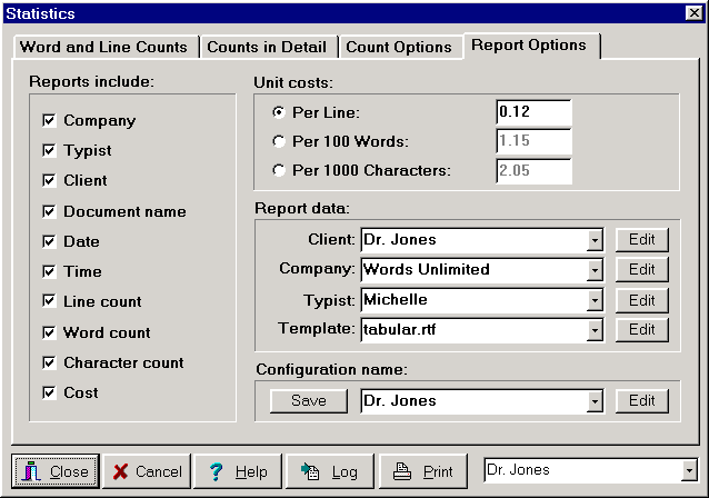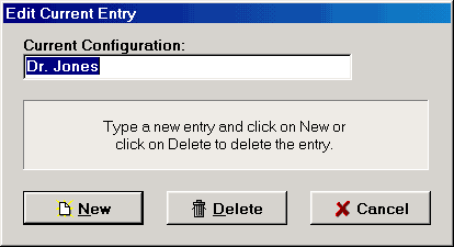 ![]() Here, the configuration is called "Dr. Jones", named after the current client, and selecting this configuration name automatically sets the values currently shown in the options pages. This includes the client name, the company and typist, the template, the Unit cost used for this doctor and and all other count options. The configuration combo box is actually duplicated at the bottom of the line count dialog, at the right of the buttons. This provides a fast way to select a current configuration from any page of the line count dialog. Improved dialog for adding or deleting Adding or deleting new items to the combo boxes is now done with dialogs similar to the one shown below: