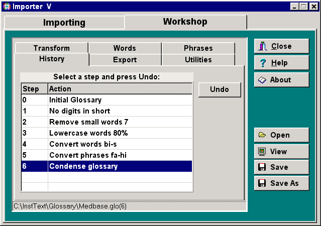 ![]() The above example illustrates what can be done in the workshop. It starts with Medbase.glo, removes digits in short forms, then it removes words of less than 7 characters, converts words to lowercase, converts words to phrase entries using the first two and the last letter, converts short forms for two word-phrases by taking the first two letters of each word, and finally condenses the resulting glossary. After each step it is possible to view the glossary obtained. Glossary cleanup and pruning The Transform panel provides various methods for cleaning up and pruning a glossary: