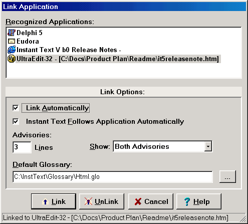 ![]() If Link Automatically is selected, linking to the application no longer requires using the link dialog. As soon as that application is active, Instant Text is automatically linked. This happens when you start the application or when you activate it, whether it is with the mouse or with Alt+Tab. The application dictates its size and place Now that Instant Text links to the application, it makes sense to have it resize itself to match the size of the application. This means that IT follows the application. It also means that if you have carefully arranged several windows on your screen, IT is not going to change the arrangement. So with Version V, if you resize an application, this resizes IT. Similarly if you move an application to another place, IT follows. And you will see Instant Text moving and resizing itself as you switch to different applications. There are other aspects of this adaptability: The application dictates the glossary and the advisories Pressing Link Options displays a panel with more options: You can now specify the number of advisory lines to use for an application. For example, you may want 6 lines in Word for heavy text entry and only one or two for an email application. Below we specified 3 lines for UltraEdit: