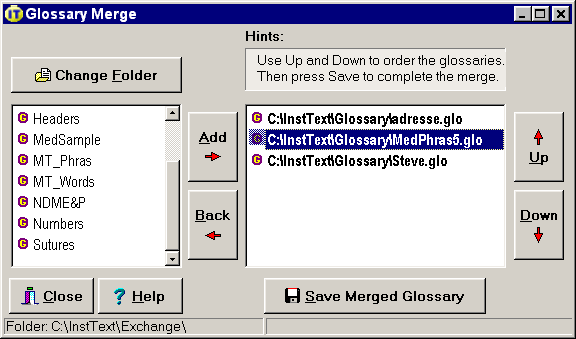 Instant Text V Pro new Merge Glossary dialog makes it very easy to merge several glossaries in a single operation: