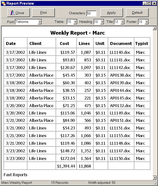You may adjust the fonts and font sizes for the various parts of the report before printing it. You may also save the report as a file (in html format) and include it in an MS Word or WordPerfect document to prepare an Invoice. As said by an early user of Instant Text V Pro: