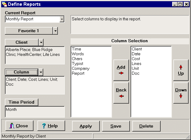 - are selected with the second button on the left in a similar manner. You can select the columns that will appear in the reports, assign titles to appear at the tops of those columns, select the columns that will be totaled in the report, and add text to the report.