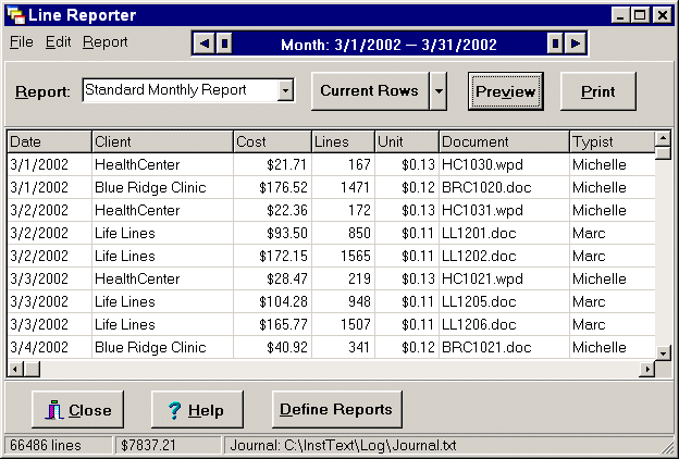 The Line Reporter is a new tool to manage the data base of individual line counts created with Instant Text. It makes it very easy to view various reports and to generate invoices.