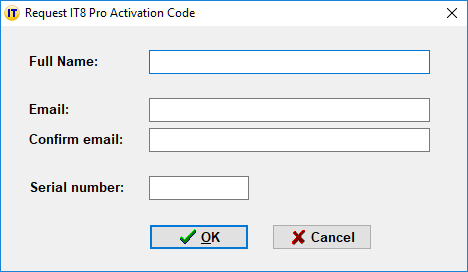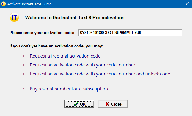 If it is not yet activated, the Activate Instant Text 8 Pro dialog will pop up automatically when you start IT8 Pro, allowing you to request an activation code: