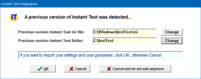 If you have installed ITV Pro or IT7 Pro on the current computer, the Instant Text Migration dialog will popup and propose to migrate your settings and glossaries: