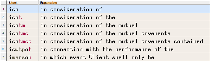 After typing ico, the expansion table displays:
