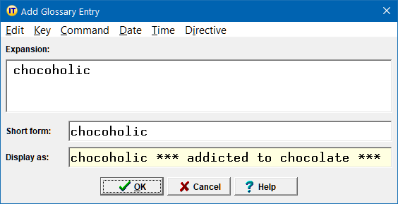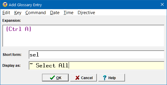 Note that here, as a convention we use a ~ prefix in our display form, so that when it pops up in the Expansion Table, we immediately recognize that it is a command entry. You are, of course, free to use your own convention for command display forms.