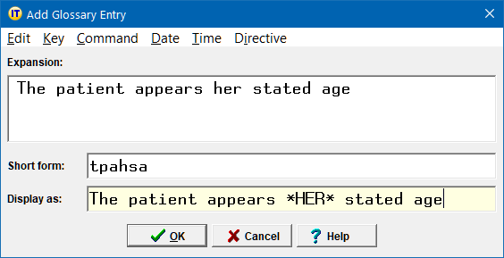 In the following example we defined a glossary entry with the keyboard shortcut