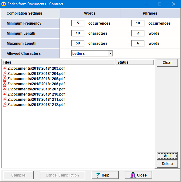 To compile a glossary click on the Add button to add the documents you want to compile, update your Compilation Settings if needed, and click on the Compile button.