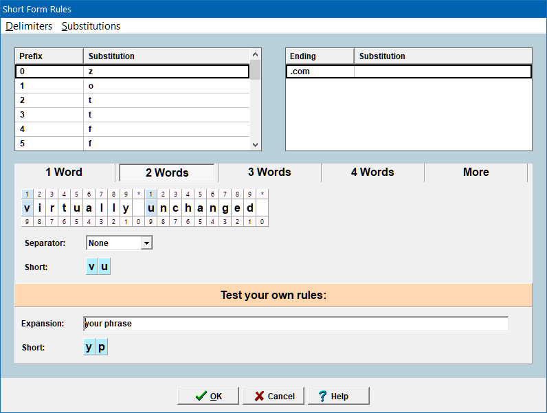 Prefix and Ending Substitutions can be added via the Substitutions menu.
