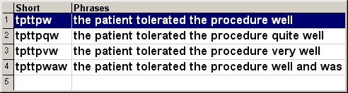 In the example that follows, we are using a medical glossary called Medstart. So after typing tppw to get the patient tolerated the procedure well, we'll see the Phrase Advisory displaying continuation after continuation. Just after typing tppw, the Phrase Advisory appears as follows: