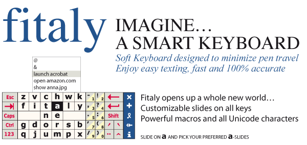 The Fitaly keyboard for the Tablet PC is an ergonomic replacement for the standard on-screen Qwerty keyboard.