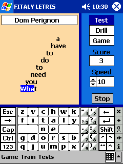 See the FitalyLetris Overview , the Tips on FitalyLetris, and the Training Tips by Hannes Frischat. While FitalyLetris was developed to help Fitaly users, it can be used with any input method. It has also been used to do comparative evaluation of input speeds in the Dom Perignon Speed Contest.